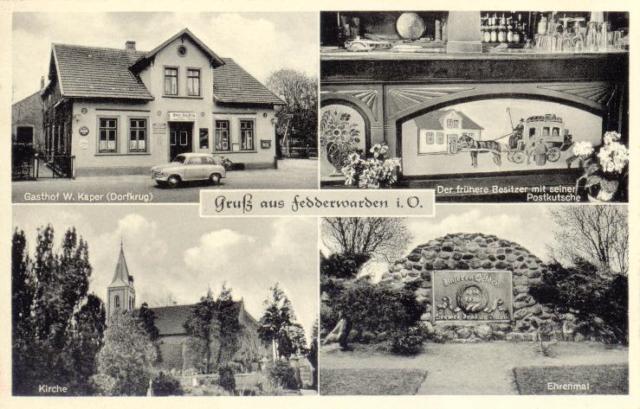 Der Dorfkrug in Fedderwarden auf einer Ansichtskarte aus den 1950er Jahren.