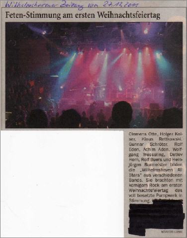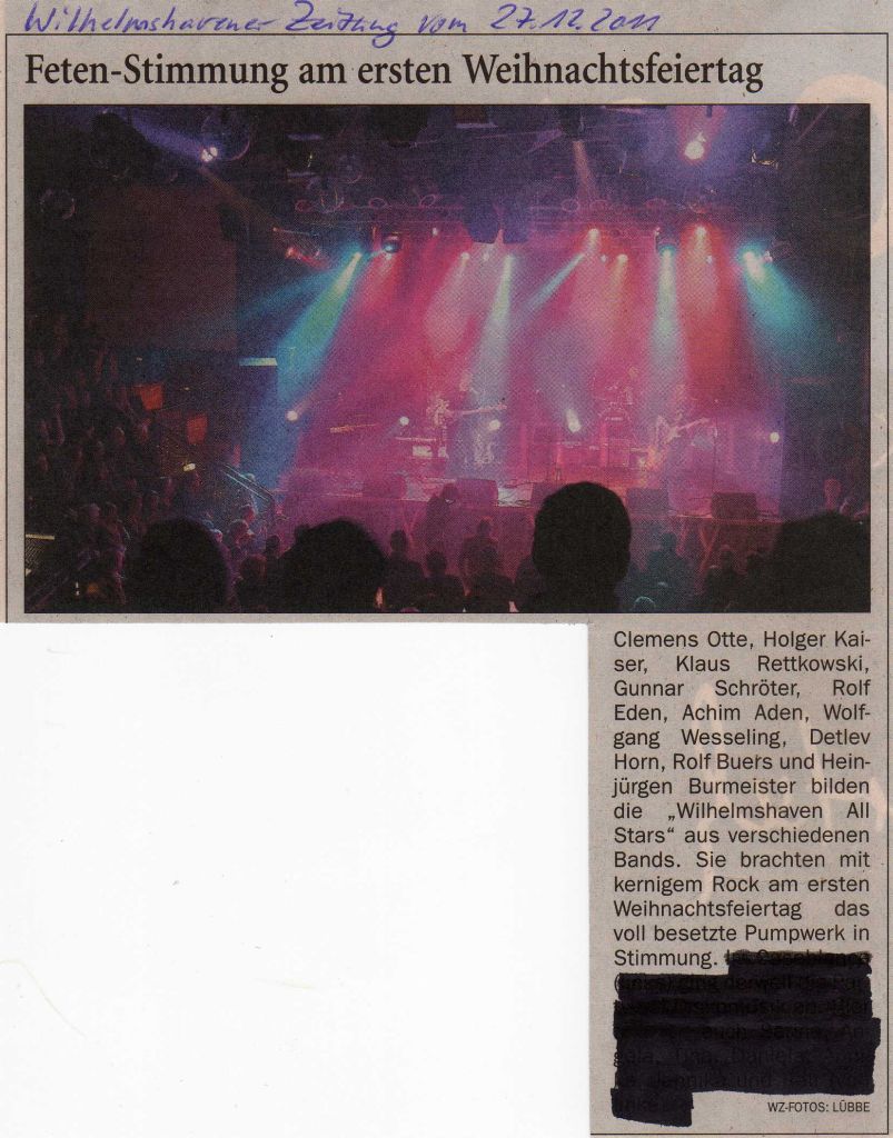 Als WHV-Allstarsäcke standen auf der Bühne: Achim Aden, Rolf (the animal) Buers, Heinjürgen (Henry) Burmeister, Rolf (James) Eden, Detlef (Deddy) Horn, Holger (Slowhand) Kaiser, Clemens (Little Mick) Otte, Klaus (Rettich) Rettkowski, Gunnar (gforce) Schröter, Wolfgang (Wede) Wesseling