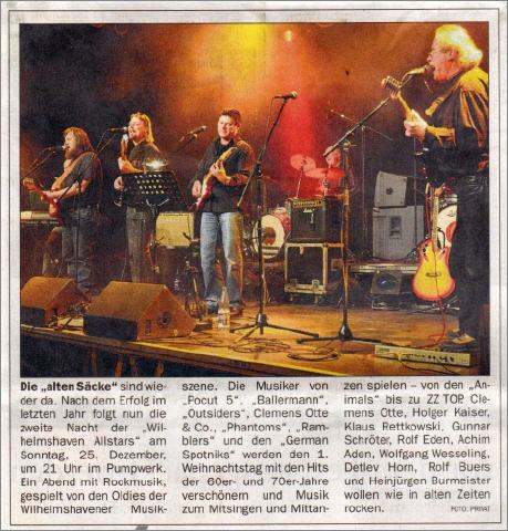 Die 2. "Nacht der alten Säcke" fand am 25. Dezember 2011 im Pumpwerk Wilhelmshaven statt. Das Kulturzentrum war mit 600 bestens gelaunten Gästen ausverkauft und damit proppevoll.