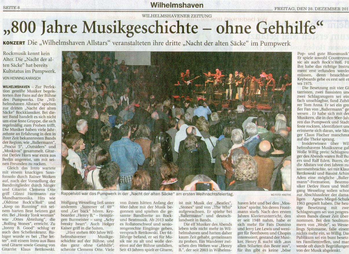 Die 3. "Nacht der alten Säcke" fand am 25. Dezember 2012 im Pumpwerk Wilhelmshaven statt. Das Kulturzentrum war mit nahezu 600 bestens gelaunten Gästen ausverkauft und damit proppevoll.